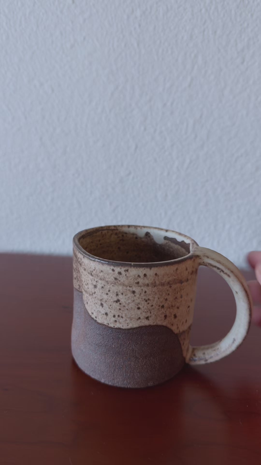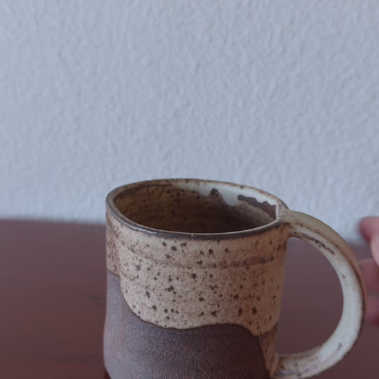 This piece features a deep, earthy glaze with soft variations in tone with hints of warm white gently showing through. A thumb rest on body invites a comfortable, steady hold.